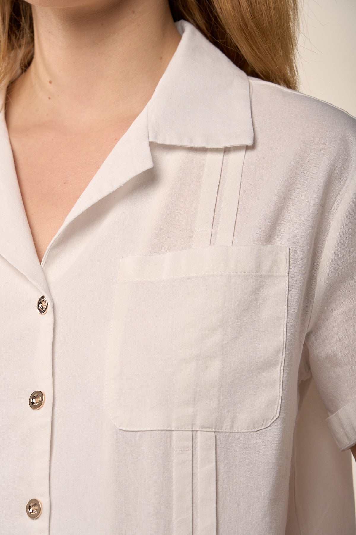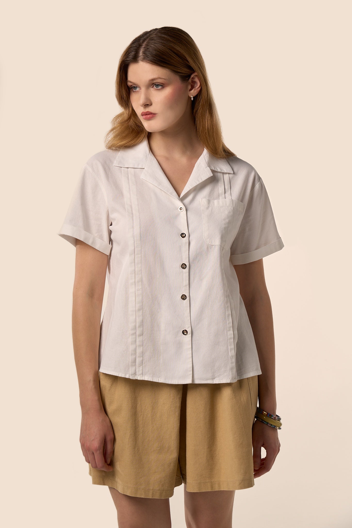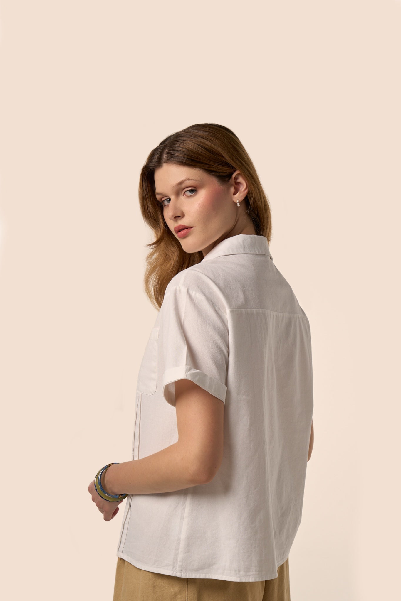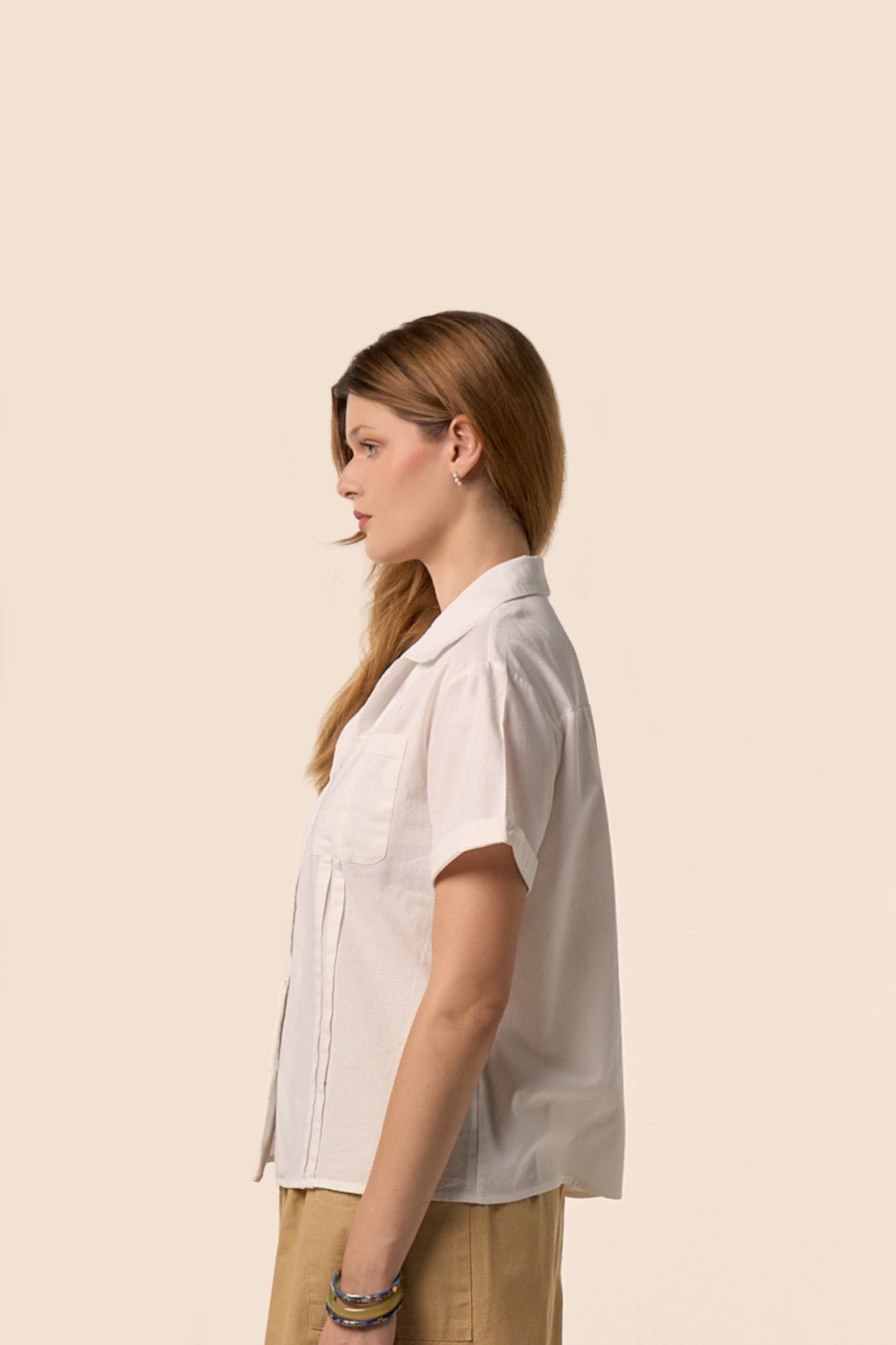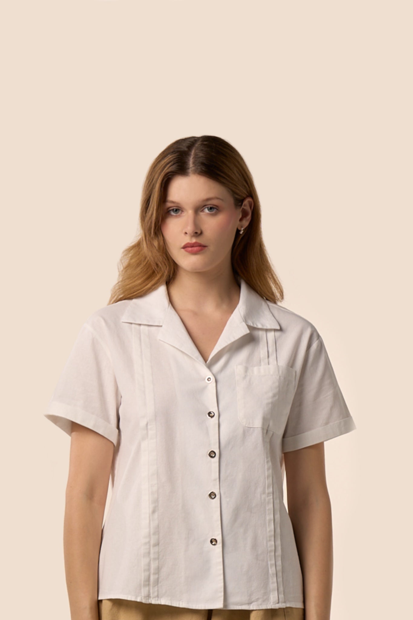 Un essentiel revisité avec une touche de douceur estivale. Le chemisier Lune emprunte ses codes à la chemise classique — col ouvert, boutons nacrés, poche poitrine — tout en offrant une allure plus fluide et contemporaine.