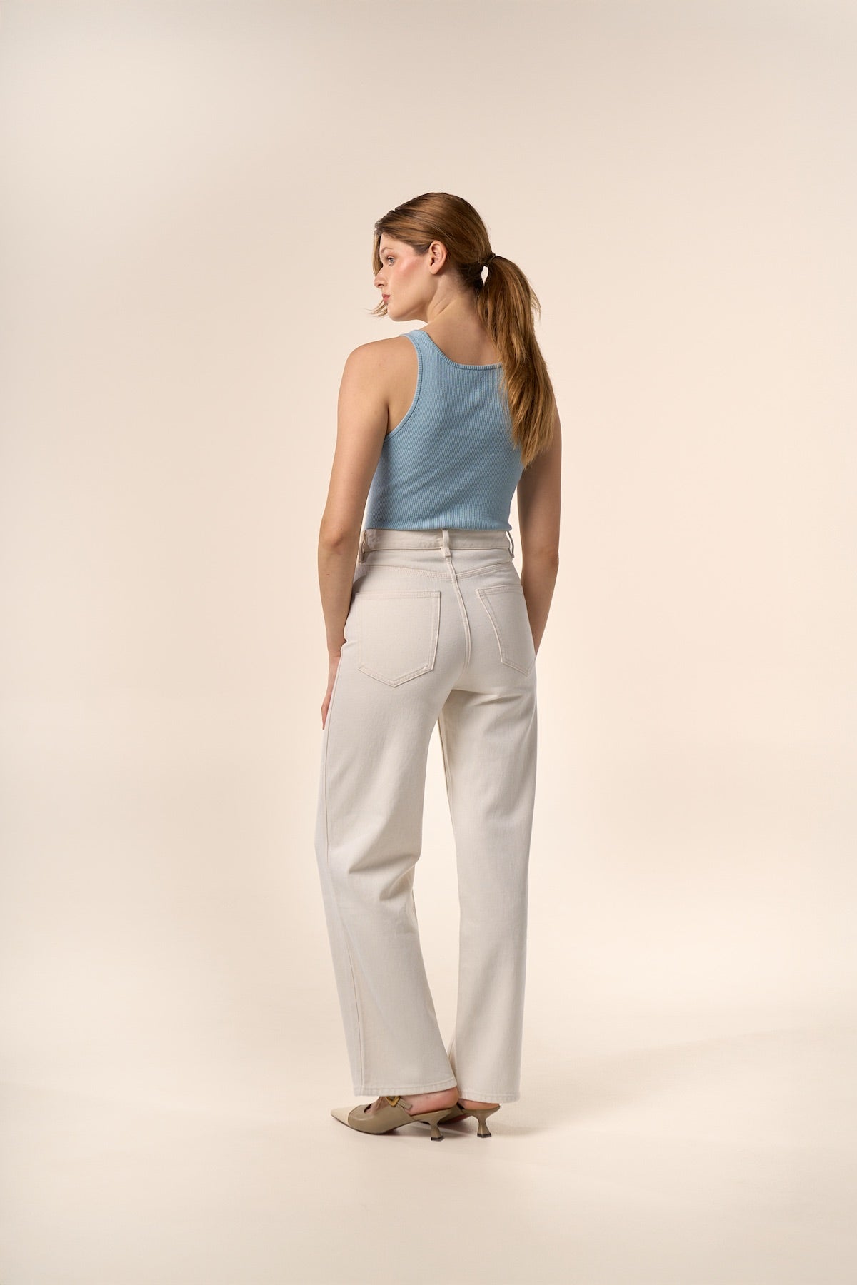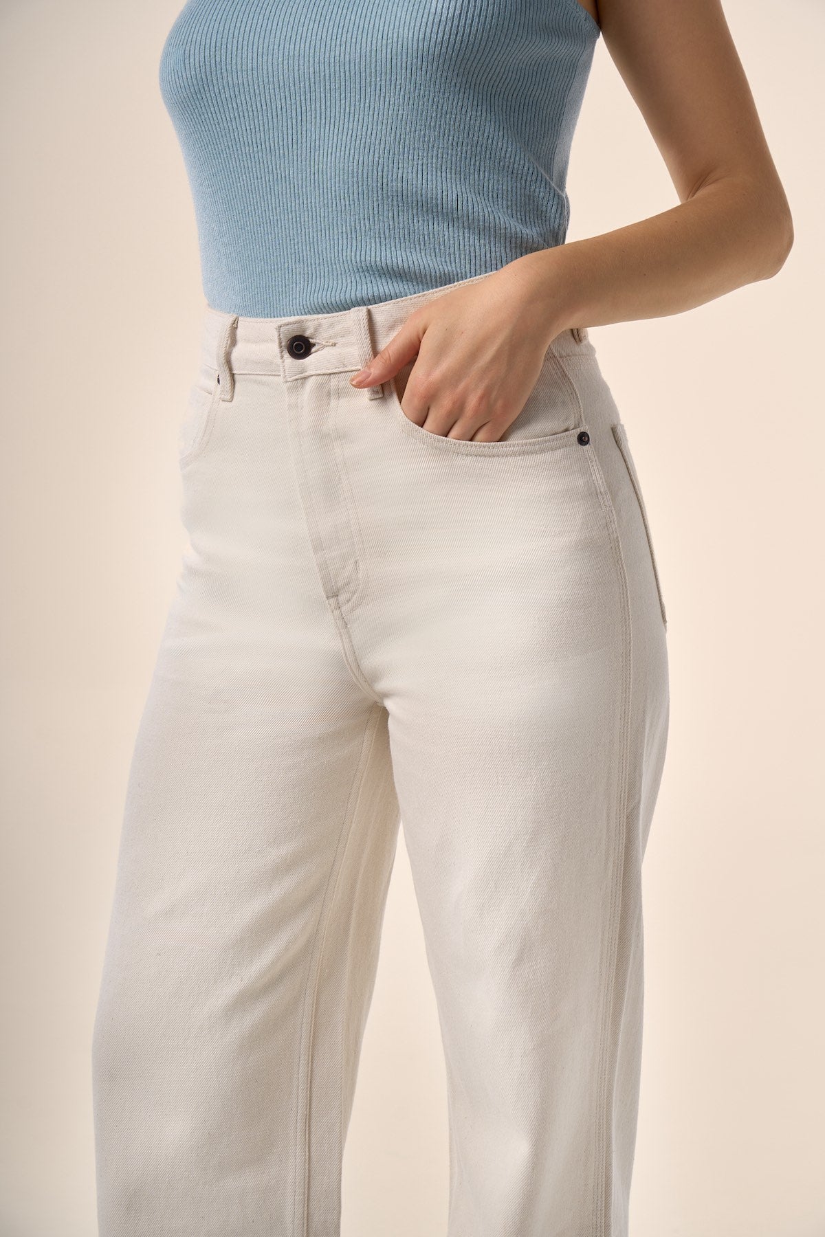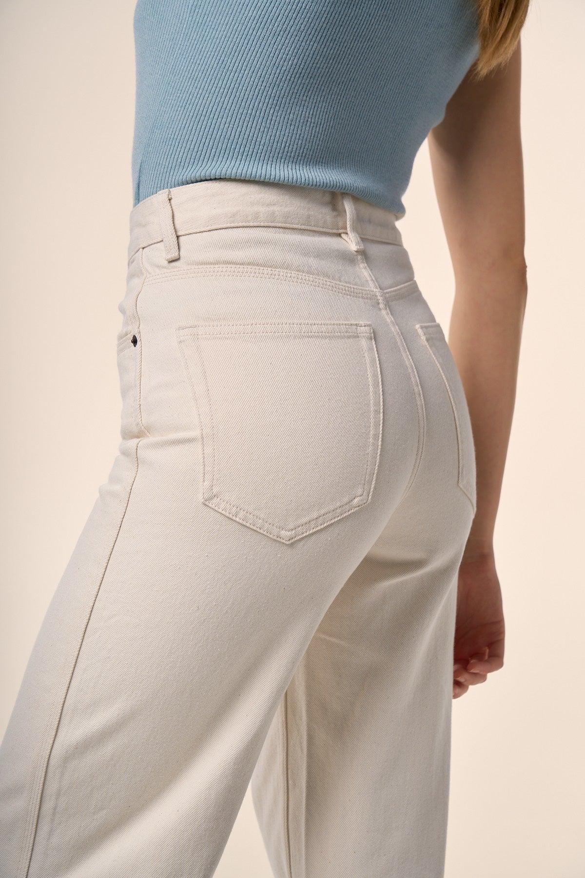 Jean taille haute à la coupe droite et épurée.