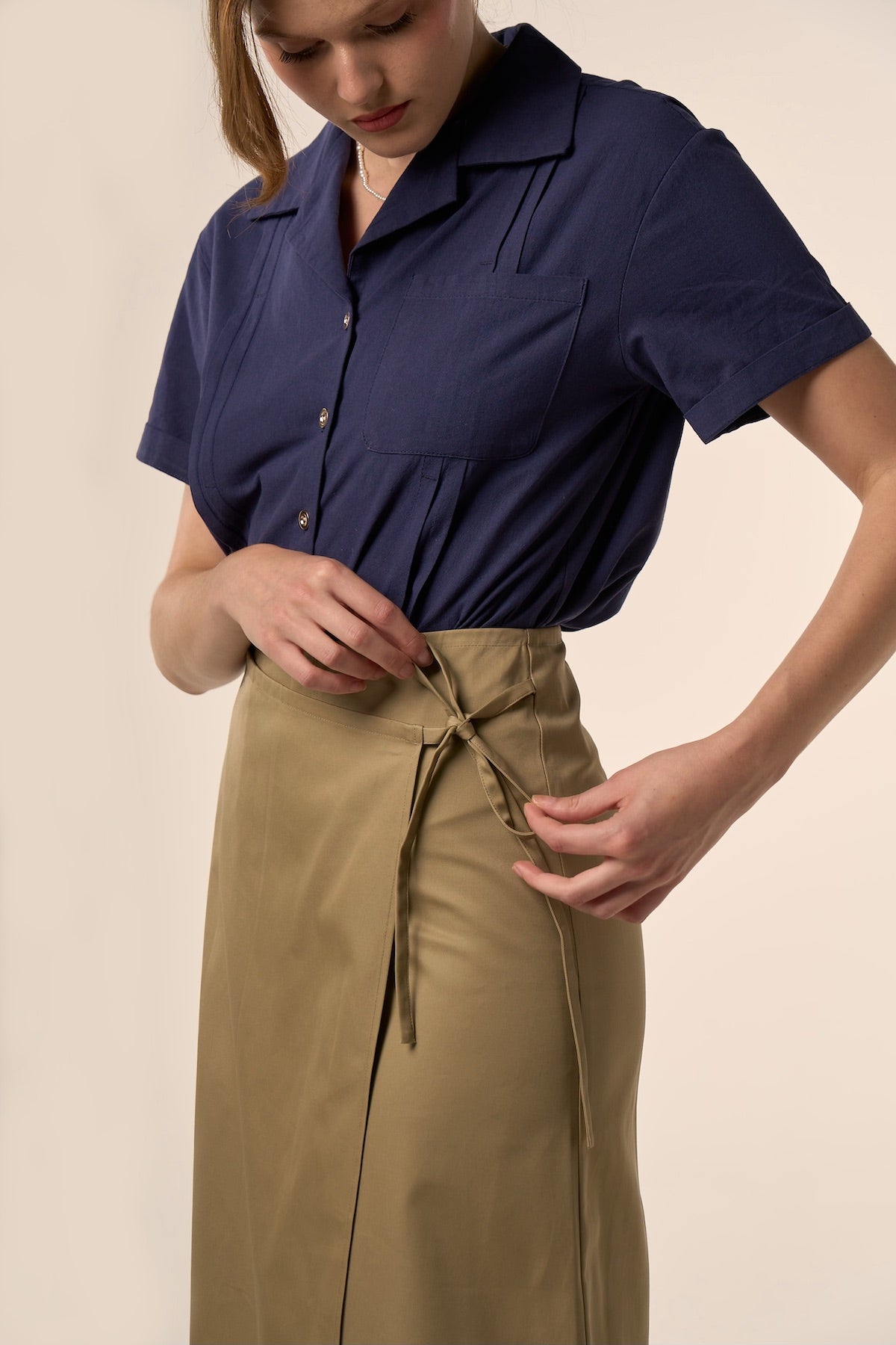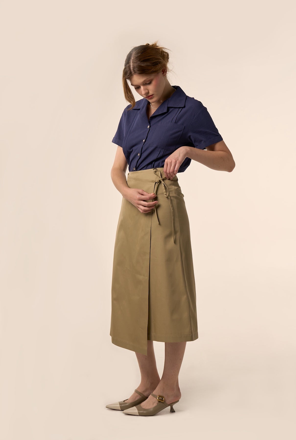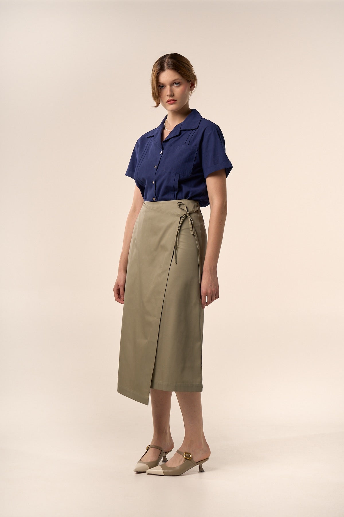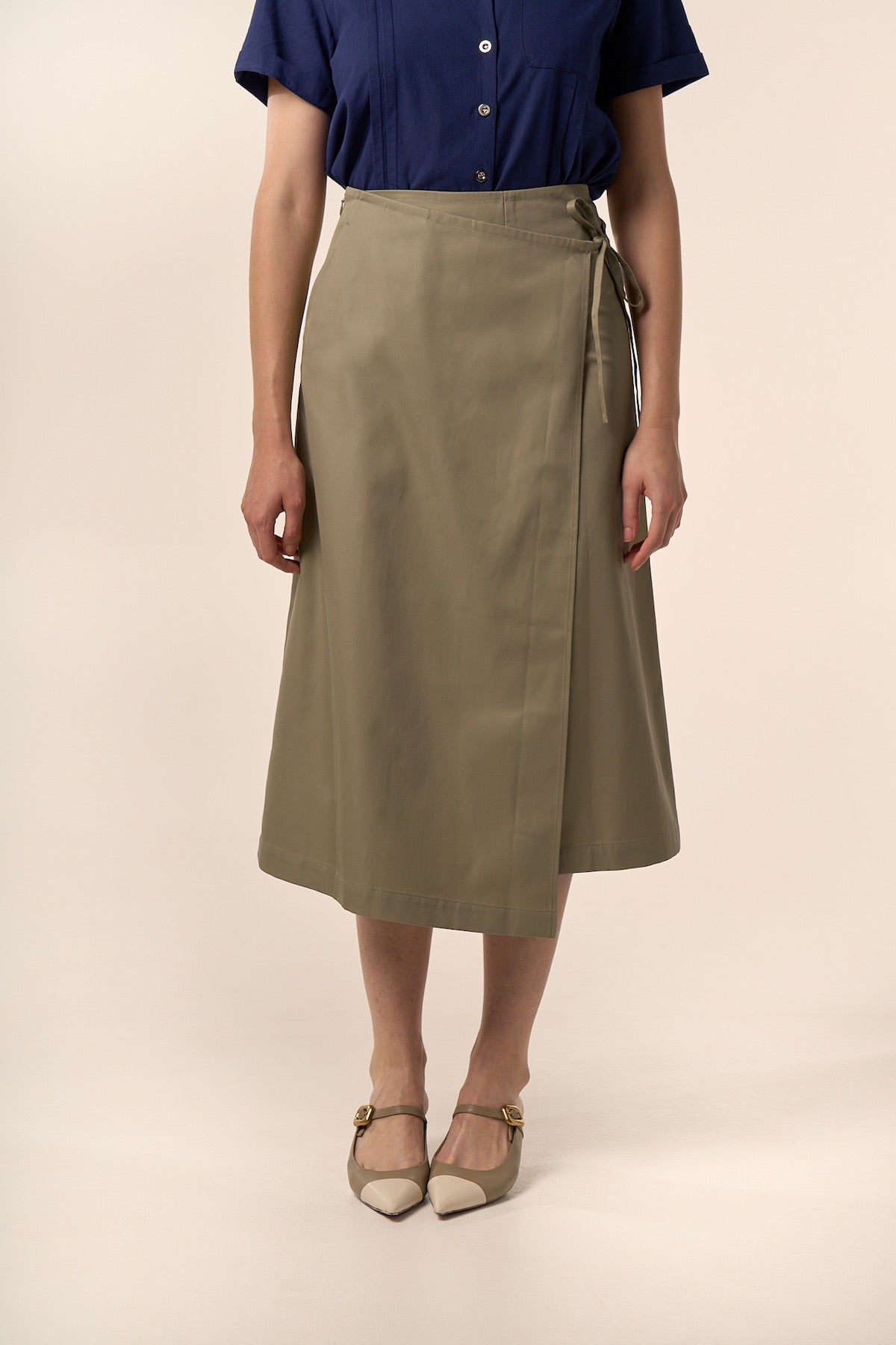 Jupe portefeuille à la coupe midi et taille haute.