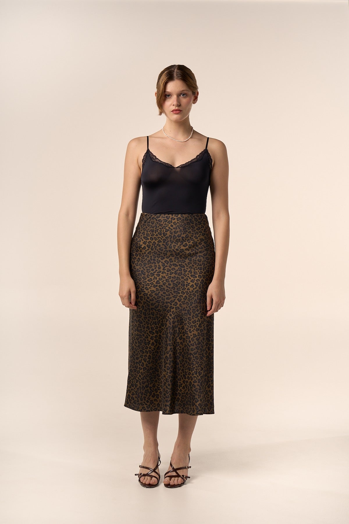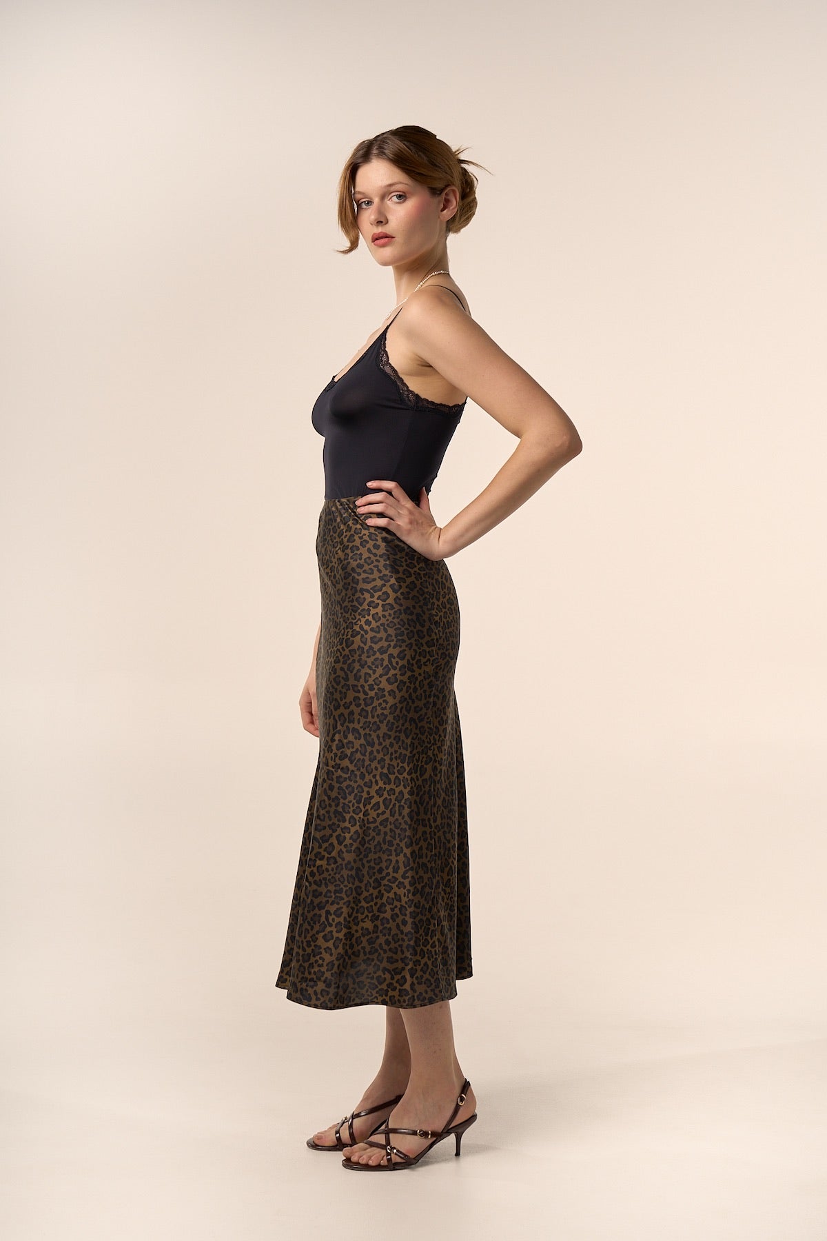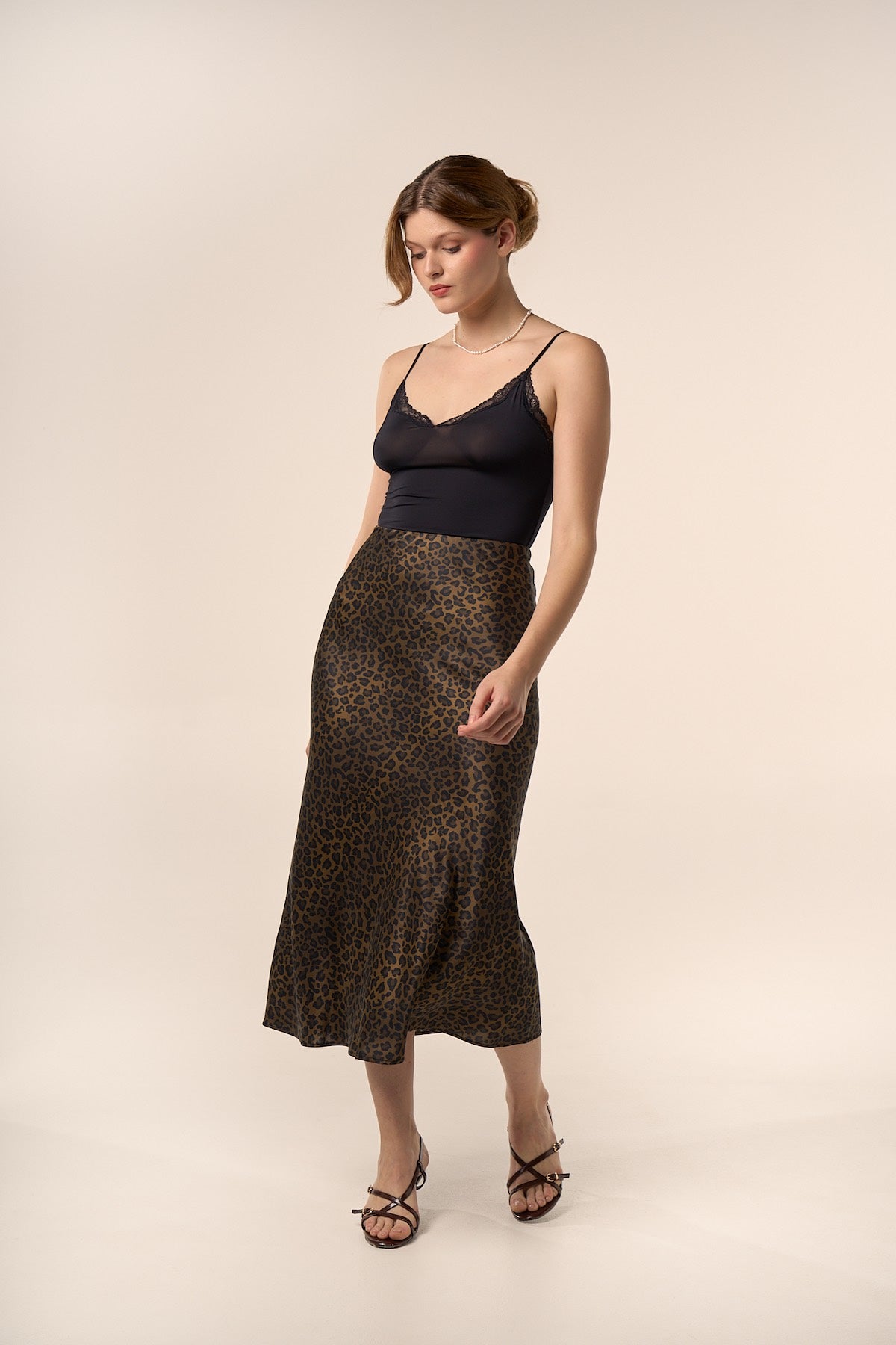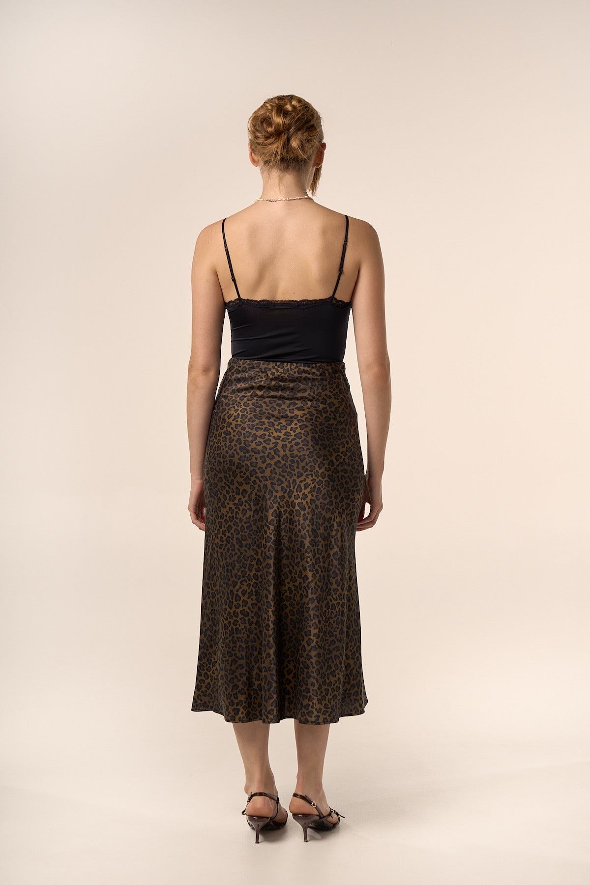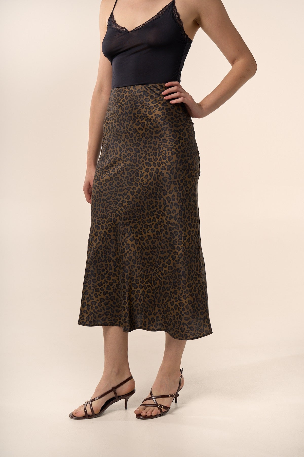 Jupe midi en soie à imprimé léopard.