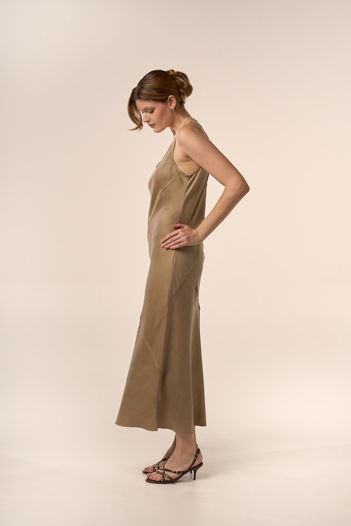 Sa coupe légèrement évasée et ses coutures en biais dessinent la silhouette avec douceur et mouvement. Un modèle à la fois minimaliste et sensuel, idéal pour les journées d’été ou les soirées lumineuses.